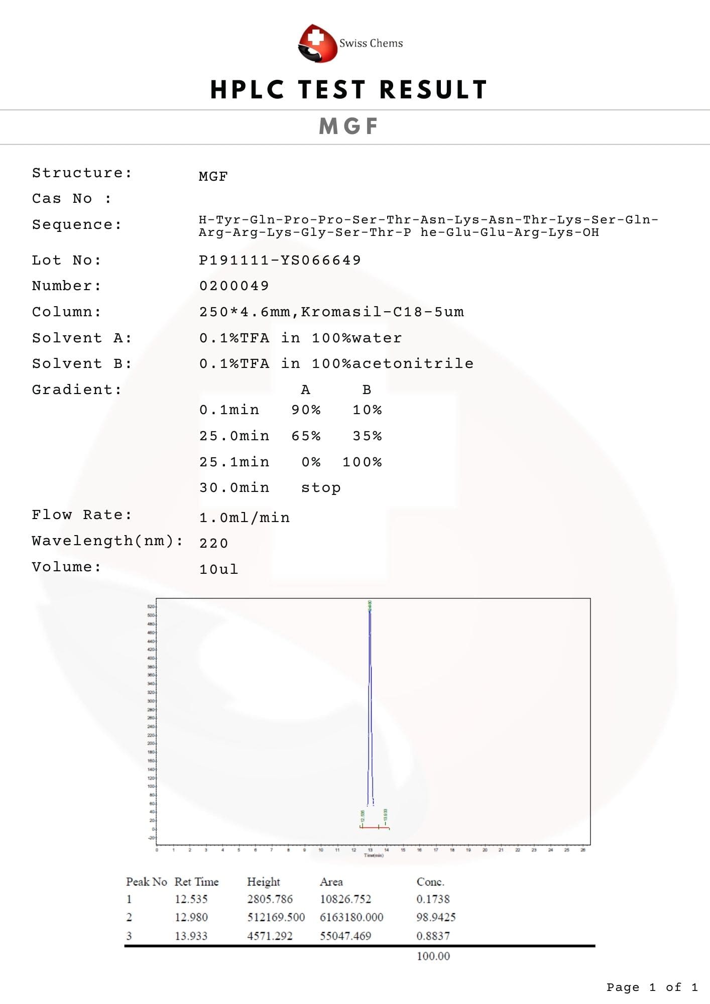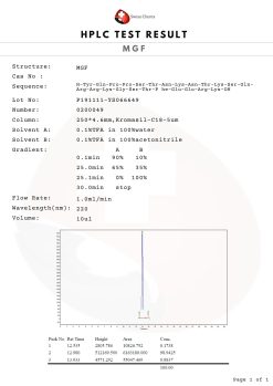 At Swiss Chems, every single batch of MGF without PEG 2 mg undergoes a rigorous multi-stage analytical testing phase before being released for distribution. We utilize High-Performance Liquid Chromatography (HPLC) to confirm exact purity levels and Mass Spectrometry (MS) to verify the precise molecular mass and structural identity. These verification steps are essential for qualified researchers who require total transparency and reliability in their chemical sourcing. Our MGF without PEG 2 mg is guaranteed to be free from common synthesis impurities, ensuring that your research outcomes are a true reflection of the compound’s potential rather than a result of contaminants. We provide batch-specific Certificates of Analysis (COA) to all institutional partners, ensuring that every milligram delivered meets the professional requirements of the global scientific community.